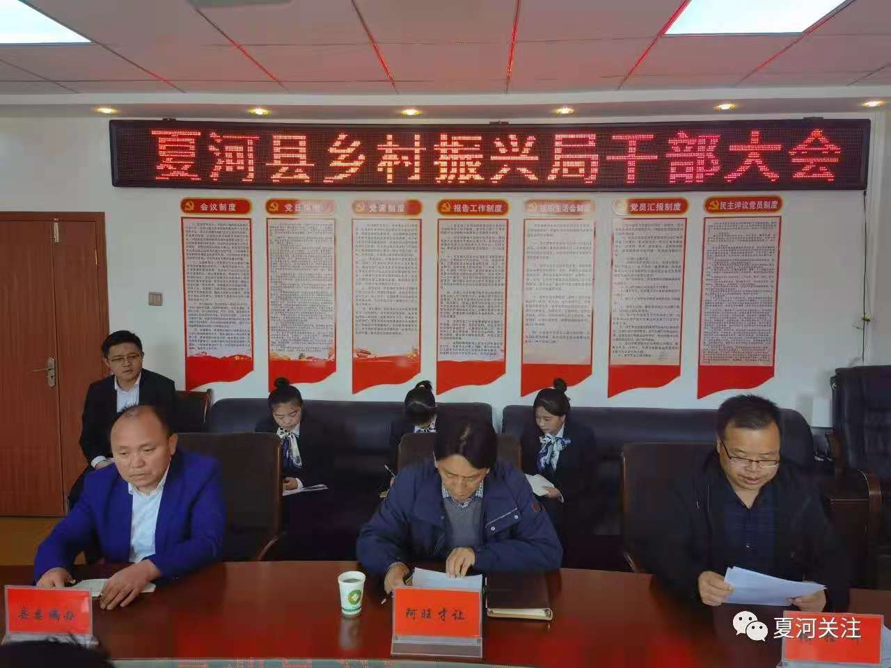 挂牌仪式结束后,召开了夏河县乡村振兴局干部大会。会议宣读了《中共夏河县委办公室、夏河县人民政府办公室关于调整县级扶贫工作机构设置的通知》、《中共夏河县委关于调整隶属县委有关党组设置的通知》、《中共夏河县委关于对涉及机构变更人员职务任免的通知》文件。