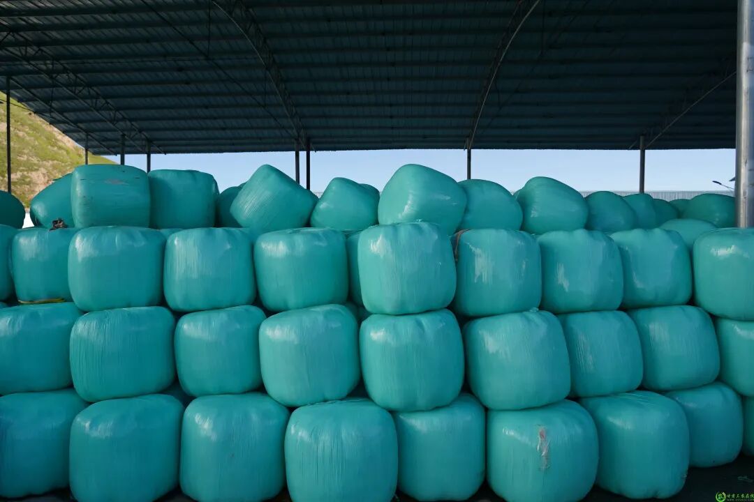 收割下来的饲草被源源不断地送入配套的拖拉机挂车,随即运往加工车间。在夏河县机械饲草料生产加工有限公司的厂区内,工人熟练地操作圆草捆打捆包膜机,经过收割粉碎的饲草在机器里被紧紧打捆,再裹上一层青绿的包膜。不一会儿,一个个圆润的青绿色草捆就此成型,接着工人们用小推车将青贮包逐一转运至仓储区。走进仓储大棚,青绿的青贮包早已堆成了小山,凑近细闻,草捆还散发着淡淡的青贮酸甜气味,仿佛在诉说着丰收的甘甜。