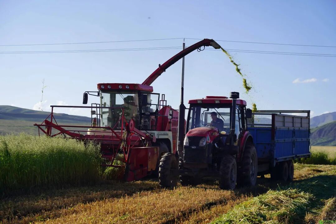 在连片的燕麦饲草地里,绿油油的燕麦穗随风摇曳,饱满的籽粒透着丰收的喜悦。青贮收割机所到之处,燕麦植株被快速收割、粉碎,细碎的草屑裹挟着淡淡的青草香,很快在田间弥漫开来。“这些燕麦是高原上的‘饲草精品’,牛羊吃了长膘快!”正在田间查看收割进度的基地技术员笑着说。