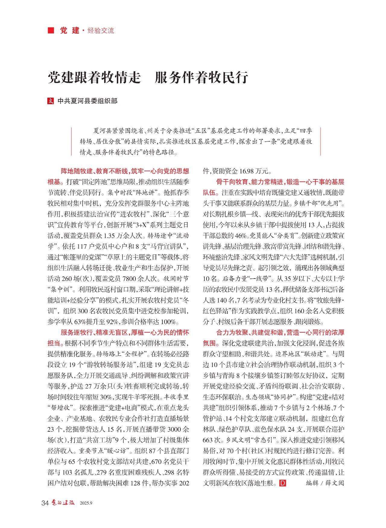 夏河县紧紧围绕省、州关于分类推进“五区”基层党建工作的部署要求,立足“四季转场、居住分散”的县情实际,扎实推进牧区基层党建工作,探索出了一条“党建跟着牧情走、服务伴着牧民行”的特色路径。