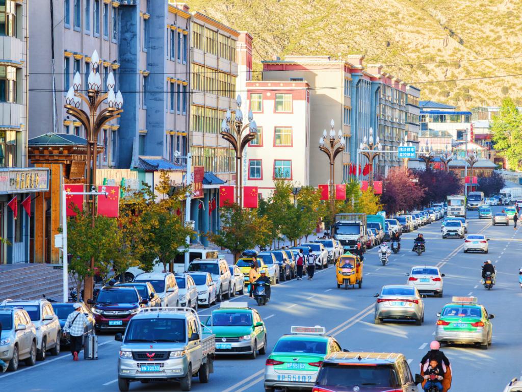 在各乡镇、县城主次干道、机关单位、学校、宗教场所及商业街区等地,统一规范悬挂国旗。鲜艳的五星红旗在蓝天白云的映衬下随风飘扬,形成一道道亮丽的风景线。无论是热闹的街头,还是宁静的校园,处处都能看到那一抹“中国红”,不仅为城市增添了节日色彩,更让广大干部群众和游客感受到强烈的爱国氛围,自豪感与幸福感油然而生。广场、街头、出租车等公共场所的LED屏幕上电子宣传标语滚动播放,以动态的形式营造出浓厚的节日氛围,让大家在潜移默化中受到爱国主义教育,简洁而有力地表达了对祖国的美好祝愿。