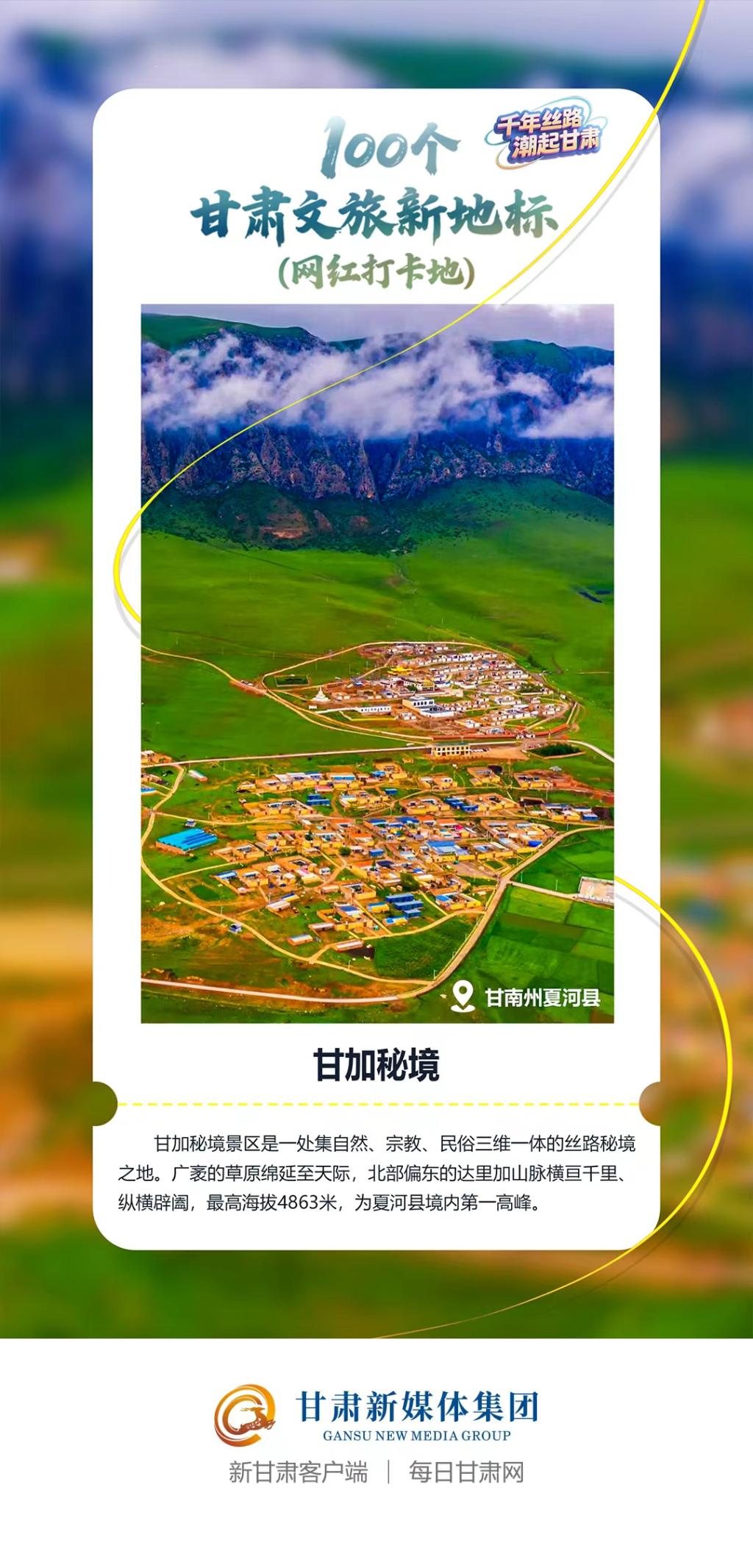 12月5日,由甘肃省文化和旅游厅主办的“千年丝路·潮起甘肃”100个甘肃文旅新地标(网红打卡地)专场发布活动在兰州举行,活动现场揭晓了100个甘肃文旅新地标名单。其中,甘南藏族自治州夏河县甘加秘境、桑科营地——香浪之都成功入选。