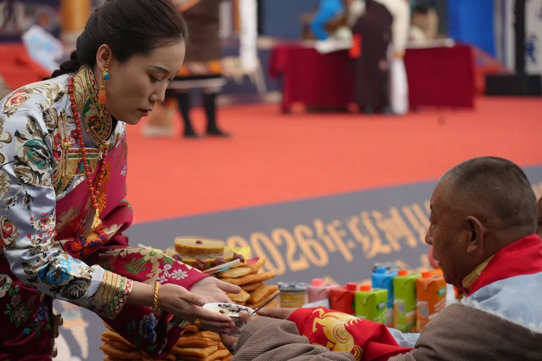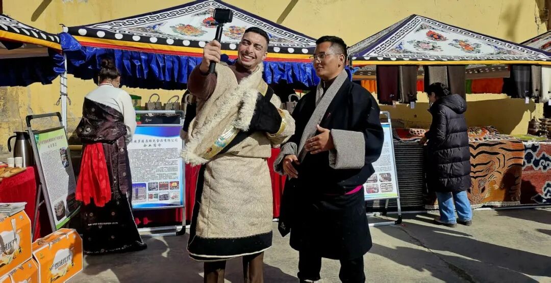 舞台之外,县域企业展销区也格外热闹。手工藏毯纹理精美,藏香袅袅沁人心脾,美酒飘香令人心醉。特色年货琳琅满目,既让非遗技艺走出深巷,也为群众带来沉浸式文化体验。村民们互相选购、道贺,暖意融融;乡镇干部也加入其中,纷纷向闻讯而来的外地游客推荐本土特色产品,温情满满。舞台上欢歌载舞诉深情,舞台下笑意融融心相依,干群同心同德,这份对家乡的热爱、对美好未来的期许,在眉眼间交融,成了新春里最动人的光景。