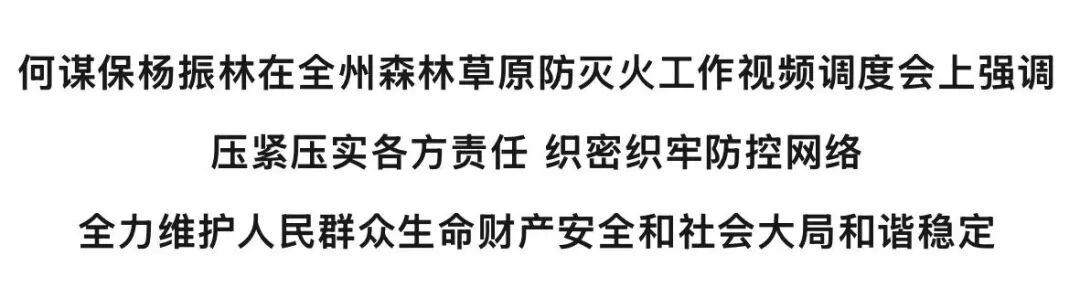 何谋保通过视频连线调度部分乡镇(街道),听取了工作情况汇报。他强调,各县(市)、各部门及各乡镇村组要时刻绷紧思想之弦,坚决克服侥幸心理和麻痹思想,严格落实“8311”工作措施,扎实做好森林草原防灭火各项工作,坚决守住安全发展底线。要紧盯当前春耕农事用火和清明祭祀用火两大管控重点,把准火险规律,强化源头管控、前端管控、精准管控,盯紧墓地周边、林缘坟场、田间地头、煨桑台等风险点,人防、物防、技防相结合,全时全域全天候开展巡查,坚决把火源堵在山下林外、防在未燃之前。要筑牢人民防线,深化森林草原防灭火知识宣传教育,多形式、多角度、多层次宣传防火法律法规,逐村逐户讲清禁火要求,营造人人关心防火、人人支持防火、人人参与防火的浓厚氛围。要紧盯关键环节,科学完善防灭火应急预案,加强日常训练和针对性应急演练,扎实开展防灭火机具、设备、物资的清点、保养和检修,确保关键时刻拿得出、调得动、用得上。要充分发挥森林草原防火指挥部牵头抓总、统筹调度作用,一体化开展预警预报、信息共享、火情报送、资源调度等工作,推动形成森林草原防灭火齐抓共管格局。要严格落实森林草原消防队伍24小时执勤、备勤、靠前驻防制度,时刻保持临战待命状态,强化动态巡查,确保突发火情“打早、打小、打了”。