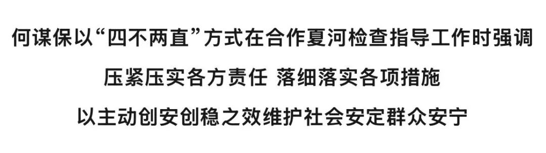 3月29日,州委书记何谋保以“四不两直”方式在合作市、夏河县检查指导工作时强调,要深入学习贯彻习近平总书记关于安全生产工作的重要论述和视察甘肃重要讲话重要指示精神,全面贯彻落实新时代党的治藏方略,压紧压实各方责任,落细落实各项措施,以主动创安创稳之效维护社会安定、守护群众安宁。