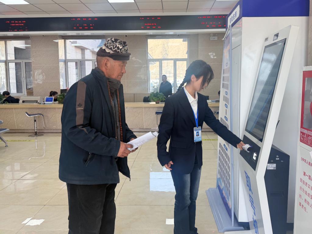 走进县政务服务中心,办事大厅明亮整洁、秩序井然,汉藏双语标识醒目齐全,休息区便民座椅、免费饮水机、AED急救箱等设施一应俱全,处处彰显着细致周到的服务理念。前来办事的群众刚走进大厅,佩戴“卓玛帮办”标识的工作人员便马上上前询问:“您好,请问您要办理什么业务?”在清晰了解办事需求后,工作人员熟练协助取号,同时引导群众前往对应窗口办理业务,服务贴心、行动高效。
