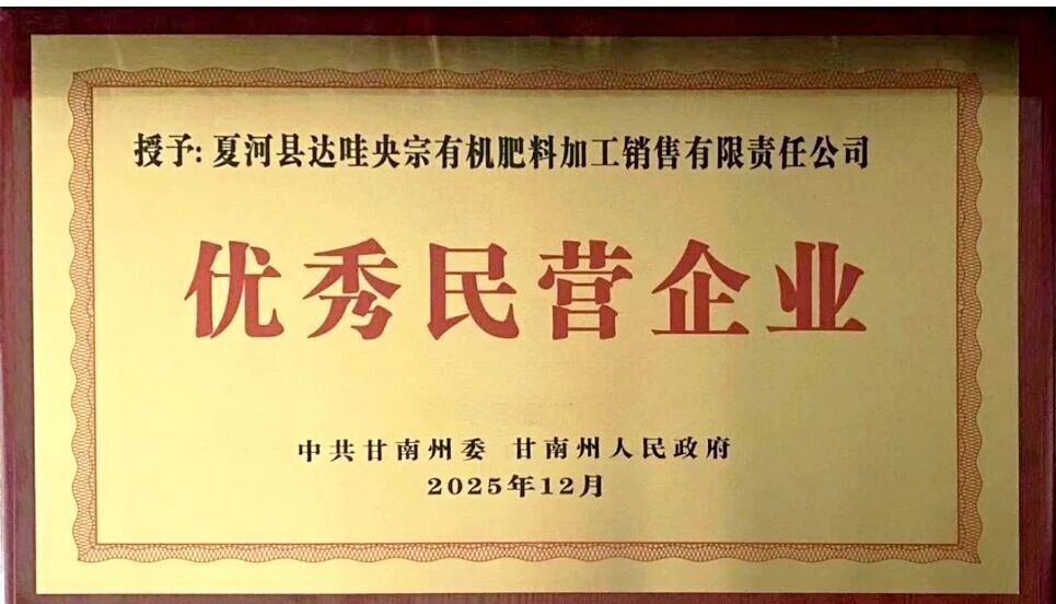 扎根夏河、服务家乡,是不少本土企业不变的初心与坚守。凭借在生态产业发展、履行社会责任等方面的突出表现,2025年12月,夏河县达哇央宗有机肥料加工销售有限责任公司荣获甘南州“优秀民营企业”称号,这份荣誉,是对企业深耕有机肥产业、坚持生态优先发展、带动群众增收致富、积极履行社会责任的充分肯定与褒奖。