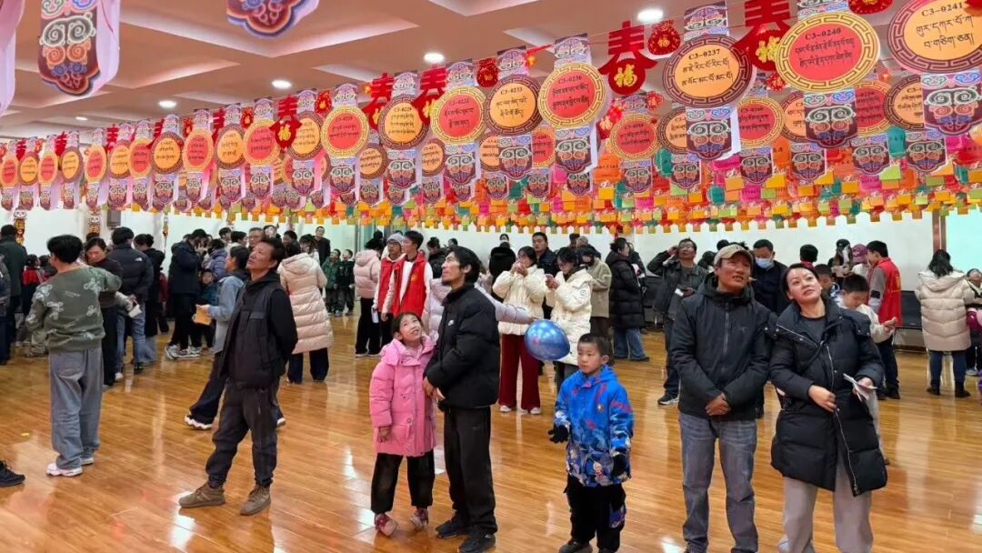 活动现场张灯结彩,红彤彤的灯笼下悬挂着数百条汉藏双语灯谜,兼具知识性与趣味性。汉语谜题涵盖诗词成语、科普知识等内容,藏文谜题则融入当地民俗、谚语智慧与传统生活场景,贴近群众生活。