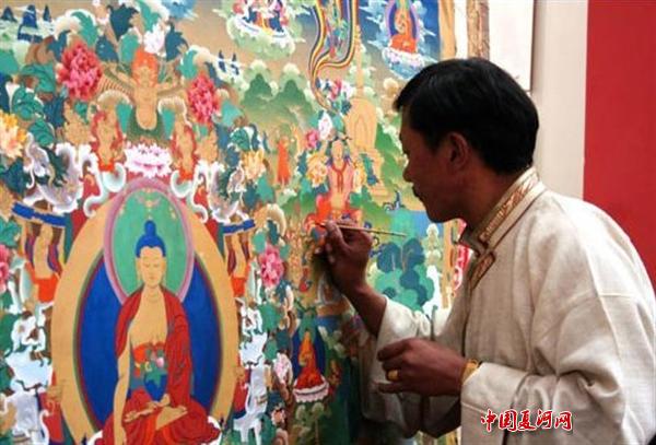 唐卡画是拉卜楞地区保存数量最多,最具有民族特色的艺术作品,在拉卜楞寺有近万幅藏品。唐卡画有佛像、菩萨像、护法神像、宗教生活等。唐卡画色彩绚丽,对比强烈,且善用金银描画,画风独特有很深的造诣。按质地和制作手工艺一般分为三类,即:绘制唐卡、织物唐卡(包括刺绣、织锦、绿丝和巾花等)和印刷唐卡。常见的绘制唐朝卡,在布底或纸面上绘制图画后,镶缀彩缎边框,背面用绢帛托被,两端加硬木轴心画面覆盖能自由启闭的薄绢并饰有两条与画幅等长的彩带。
