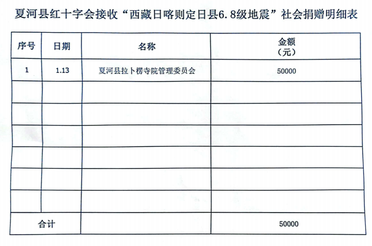 2025年1月7日至1月20日,夏河县红十字会汇聚社会各界爱心暖流,共接收社会爱心人士为西藏日喀则定日县地震灾区捐赠的善款累计金额5万元。在此,夏河县红十字会向每一位关心、支持灾区的爱心人士致以最诚挚的感谢和崇高的敬意!爱心如灯,照亮灾区希望之路;爱心似帆,承载救援磅礴力量;爱心像盾,彰显社会担当精神。让我们携手并肩,共克时艰,助力灾区群众早日走出困境,重建美好家园。现将捐赠情况公示如下,诚邀社会各界监督。若公示内容存在任何问题,请及时与我们联系,我们将立即核实更正。 县红十字会联系人:才让吉 联系电话:13884062955 附件:夏河县红十字会接收“西藏日喀则定日县6.8级地震” 社会捐赠明细单
