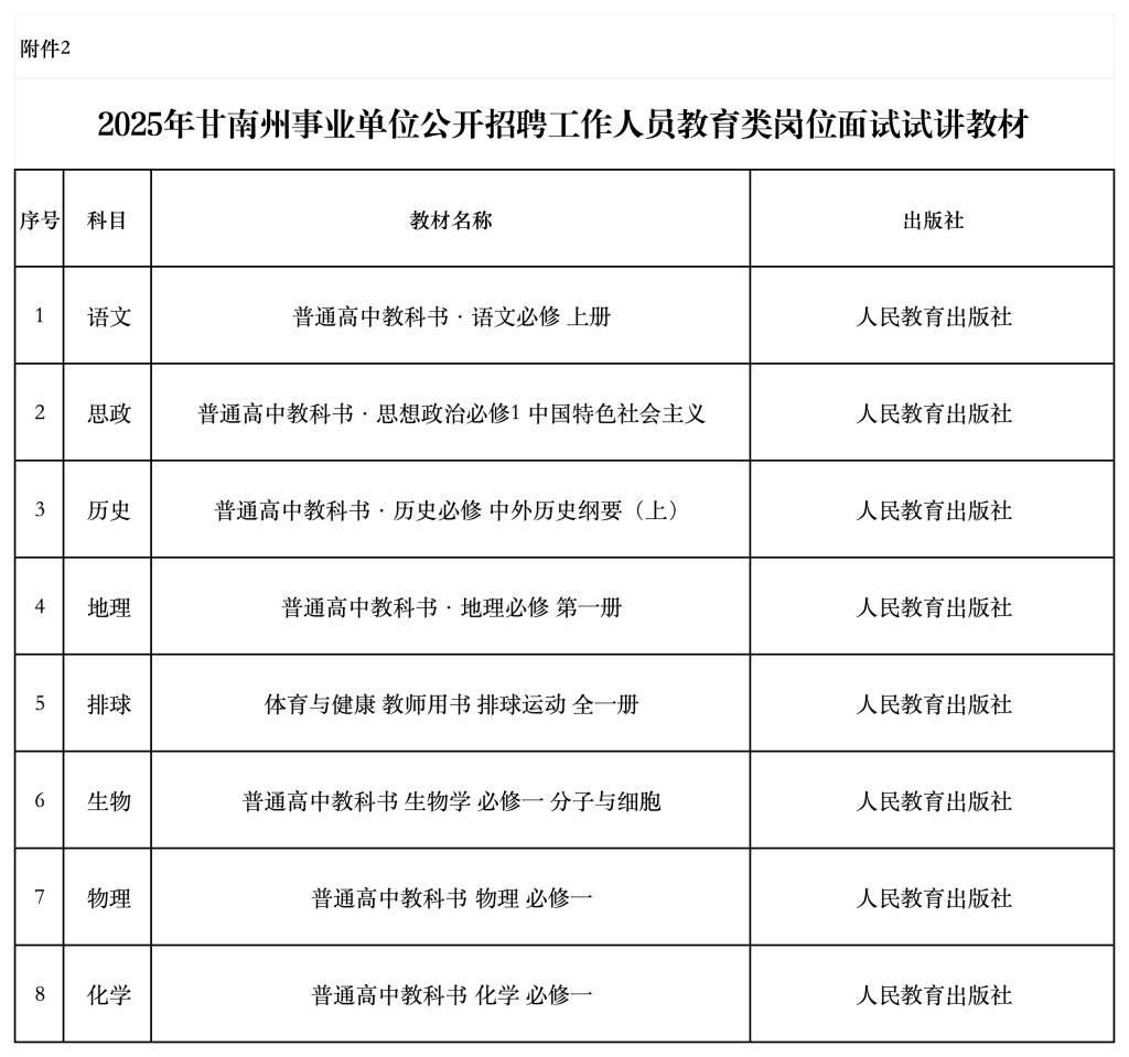 根据《2025年甘南州事业单位公开招聘工作人员公告》,现将面试工作有关事宜公告如下: 一、面试人员名单 2025年甘南州事业单位公开招聘工作人员资格复审合格人员。详见附件1。 二、面试时间、地点 面试时间为2025年10月18日(星期六),面试地点在甘南州合作二中,具体安排以面试通知单为准。 三、面试通知书打印时间 参加面试的考生,请于2025年10月14日上午10:00至2025年10月17日下午18:00期间,使用电脑登录报名链接(https://ks.gszhaopin.com),按照提示打印本人面试通知单并妥善保管。考生打印面试通知单后,应认真阅读考生须知。 四、面试形式及内容 (一)综合类岗位和医疗卫生类岗位面试采用结构化面试,面试时间10分钟。其中:有汉藏双语要求的岗位(8003、8004、8005、9003岗位),以汉语+藏语方式进行面试。 (二)教育类岗位面试采用试讲的方式,试讲内容详见附件2。备课时间15分钟,试讲时间15分钟。 (三)播音主持岗位(1039岗位)、艺术表演岗位(1020、1021岗位)采用结构化面试+现场技能展示,总分100分,结构化面试占30%,现场技能展示占70%。先采取结构化面试,面试时间10分钟。结构化面试结束以后,播音主持现场技能展示为统一出镜面试,包括现场播报、即兴主持等。时间不得超过5分钟。艺术表演岗位现场技能展示为舞蹈+特长展示,舞蹈需考生自行编排并准备音乐,特长展示由考生自行确定并准备所需道具(如器乐等),时间不得超过8分钟。 五、注意事项 (一)参加面试的考生须携带本人有效居民身份证原件、面试通知单原件参加面试。身份证丢失者,应及时到公安部门补办临时居民身份证。缺上述证件材料之一者、不按规定时间进入面试考点者,视为自动放弃,取消面试资格。 (二)参加面试的考生要仔细阅读面试通知单有关要求,因面试时间较长,请考生合理安排个人时间,提前熟悉面试地点和乘车线路,确保按时参加面试。 联系电话:0941-8212936 技术咨询电话:0931-8725531 0931-8727577 (咨询时间为上午8:30-12:00,下午14:30-18:00) 附件: 1.2025年甘南州事业单位公开招聘工作人员进入面试人员名单 2.2025年甘南州事业单位公开招聘工作人员教育类岗位面试试讲教材