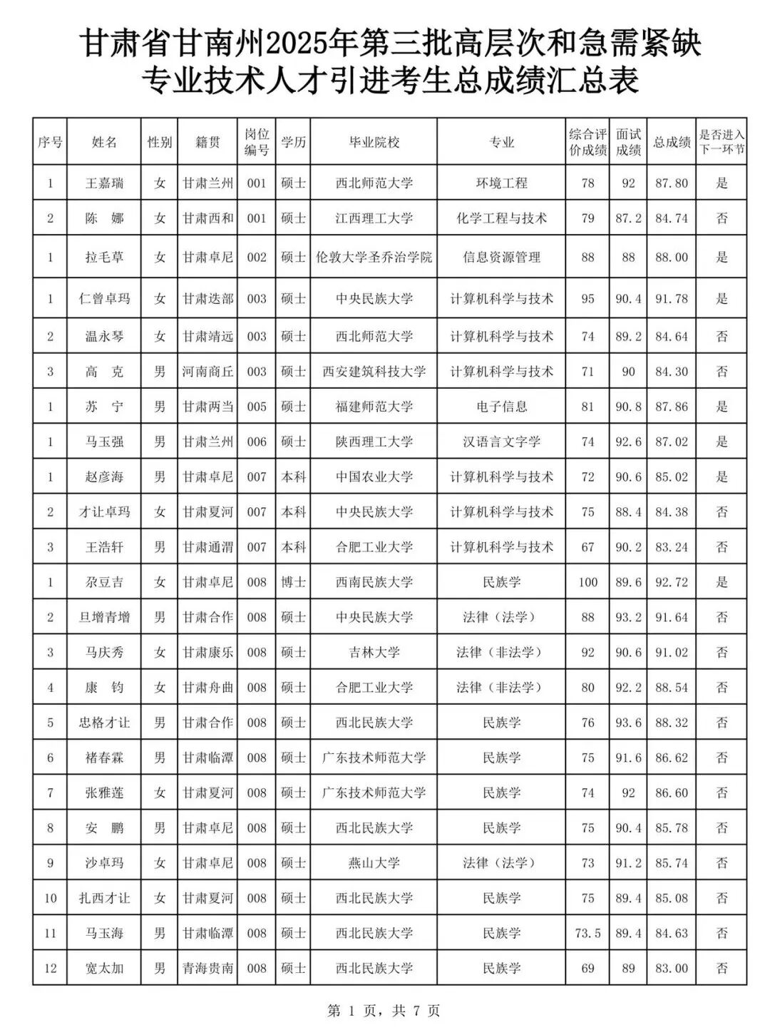 根据《甘肃省甘南州2025年第三批高层次和急需紧缺专业技术人才引进公告》,现将甘肃省甘南州2025年第三批高层次和急需紧缺专业技术人才引进考生总成绩予以公布。