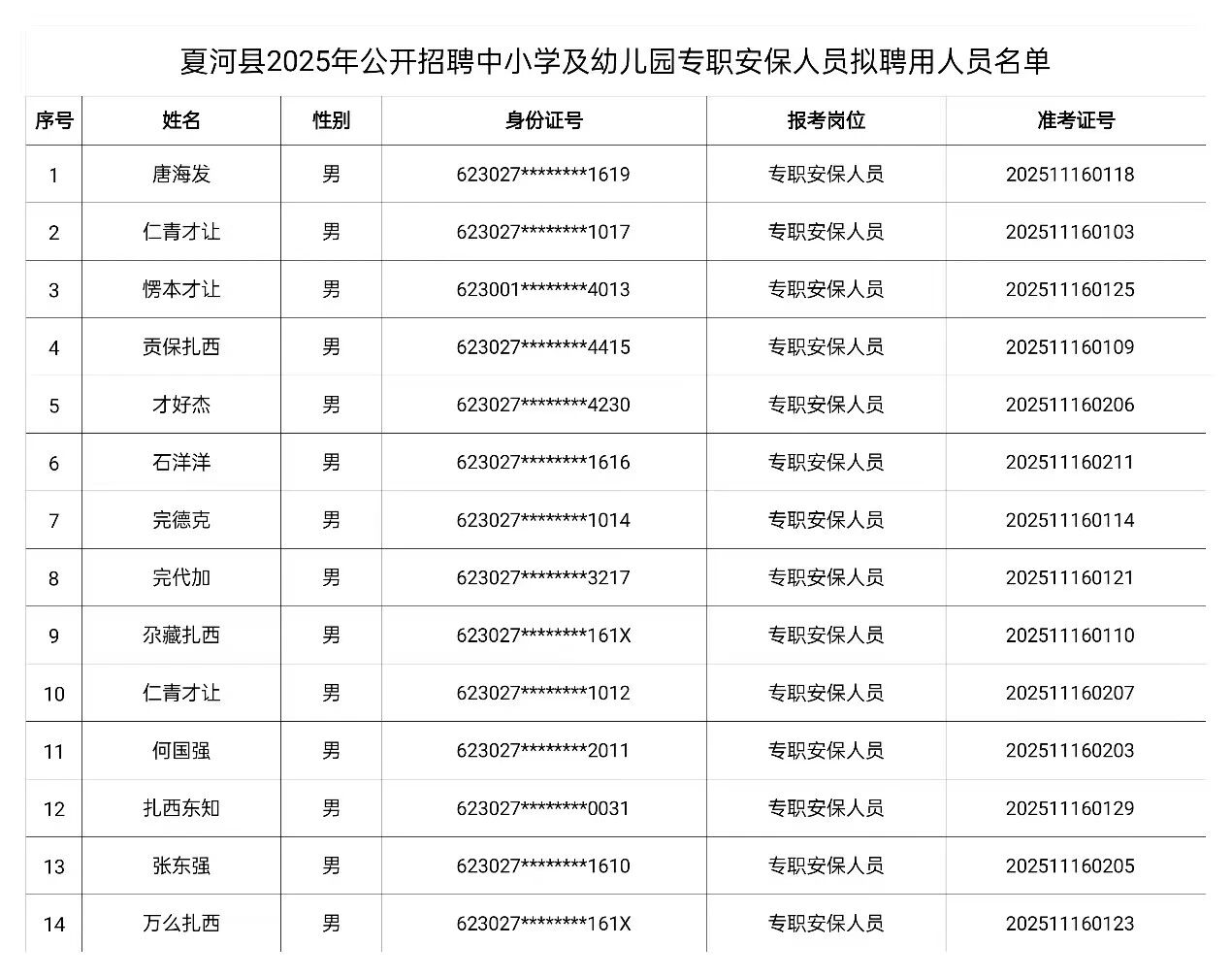 根据《夏河县2025年面向社会公开招聘中小学及幼儿园专职安保人员工作方案》,通过报名与资格初审、笔试、资格复审、体能测试、体检、考察政审等环节,确定唐海发等14名同志中小学及幼儿园专职安保拟聘用人员,现予以公示。
