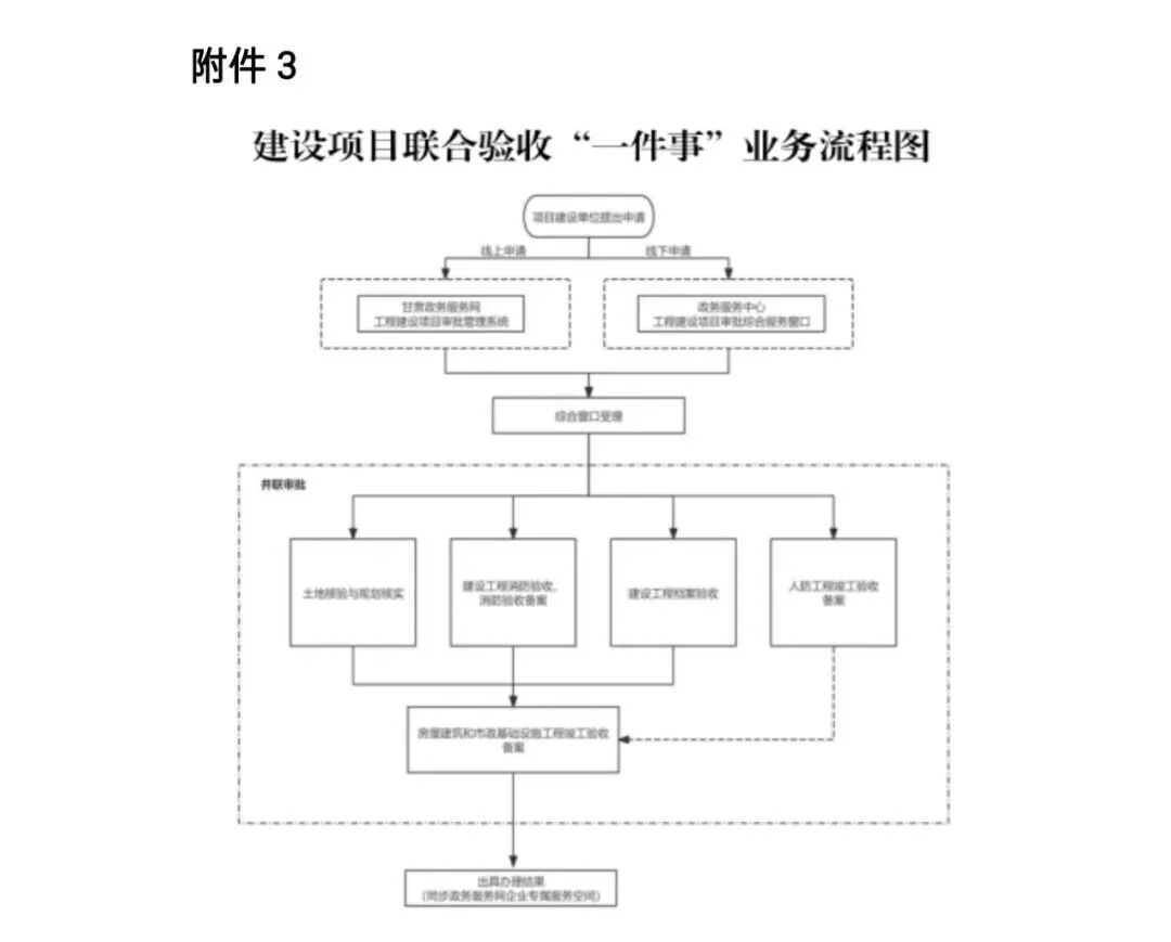 关于建设项目联合验收“一件事”办理的公告 各项目参建单位: 为了深入推进工程建设项目联合验收“一件事”集成办理工作,持续优化提升工程建设项目竣工验收便利度和服务质量,根据《甘肃省人民政府办公厅关于印发“高效办成一件事”2025年度第二批重点事项清单的通知》(甘政办发〔2025〕57号)、《甘肃省住房和城乡建设厅 甘肃省大数据中心关于印发〈建设项目联合验收“一件事”工作方案〉的通知》(甘建服〔2025〕169号)以及《甘南州住房和城乡建设局 甘南州大数据中心 甘南州政务服务中心关于印发〈甘南州建设项目联合验收“一件事”实施方案〉的通知》(州建知〔2025〕100号)等文件要求,结合我县实际情况,现将建设项目联合验收“一件事”办理有关事项通知如下: 一、目标任务 整合房屋建筑和城市基础设施等工程竣工联合验收阶段涉及的房屋建筑和市政基础设施工程竣工验收备案、建设工程档案验收、建设工程消防验收、消防验收备案、土地核验与规划核实、人防工程竣工验收备案等多部门事项,构建房屋建筑和城市基础设施工程竣工联合验收“一件事”服务模式,实现“一表申请、一窗受理、联合验收、限时办结”,提升竣工验收审批效能,助力项目早投产、早使用、早见效。 二、实施范围 适用于全县新建、改建、扩建房屋建筑和市政基础设施工程。 三、办理流程 线上办理流程。建设单位通过甘肃政务服务网甘南州工程建设项目审批管理平台提交建设项目联合验收“一件事”相关资料,工程建设项目审批综合服务窗口受理后,进行多部门并联审批,最终由综合服务窗口统一出具办理结果。 https://zwfw.gansu.gov.cn/gannan/ 线下办理流程。建设单位到政务服务大厅工程建设项目审批综合服务窗口,申请建设项目联合验收“一件事”专题服务,申请人可在窗口工作人员指导下填写表单,办理程序同线上办理。 四、事项清单 1.房屋建筑和市政基础设施工程竣工验收备案。 2.建设工程档案验收。 3.建设工程消防验收、消防验收备案。 4.土地核验与规划核实。 5.人防工程竣工验收备案。 五、申请材料