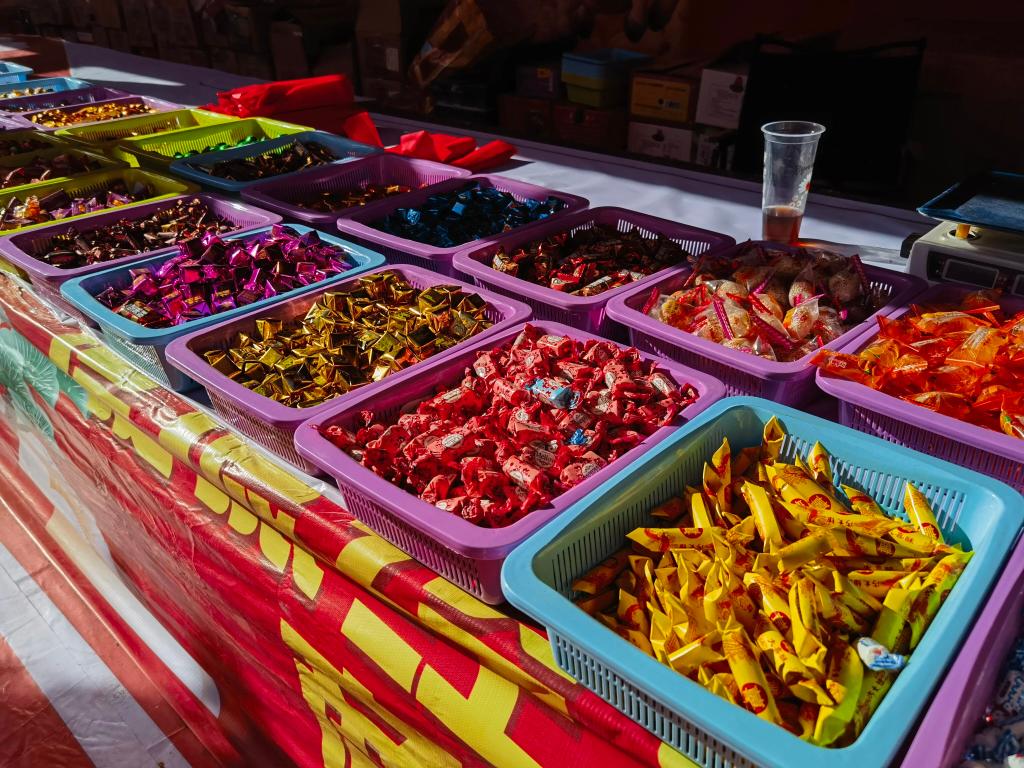 货架上的商品更是琳琅满目、目不暇接,从潮流好物到传统特产,全方位满足市民游客的采购需求。包装精美的网红零食整齐码放,各式坚果、果干散发着香甜气息;色彩鲜艳的年宵花束,成为不少家庭装点新春的首选;寓意吉祥的春联、福字挂满摊位,笔墨间承载着对新年的美好期许。